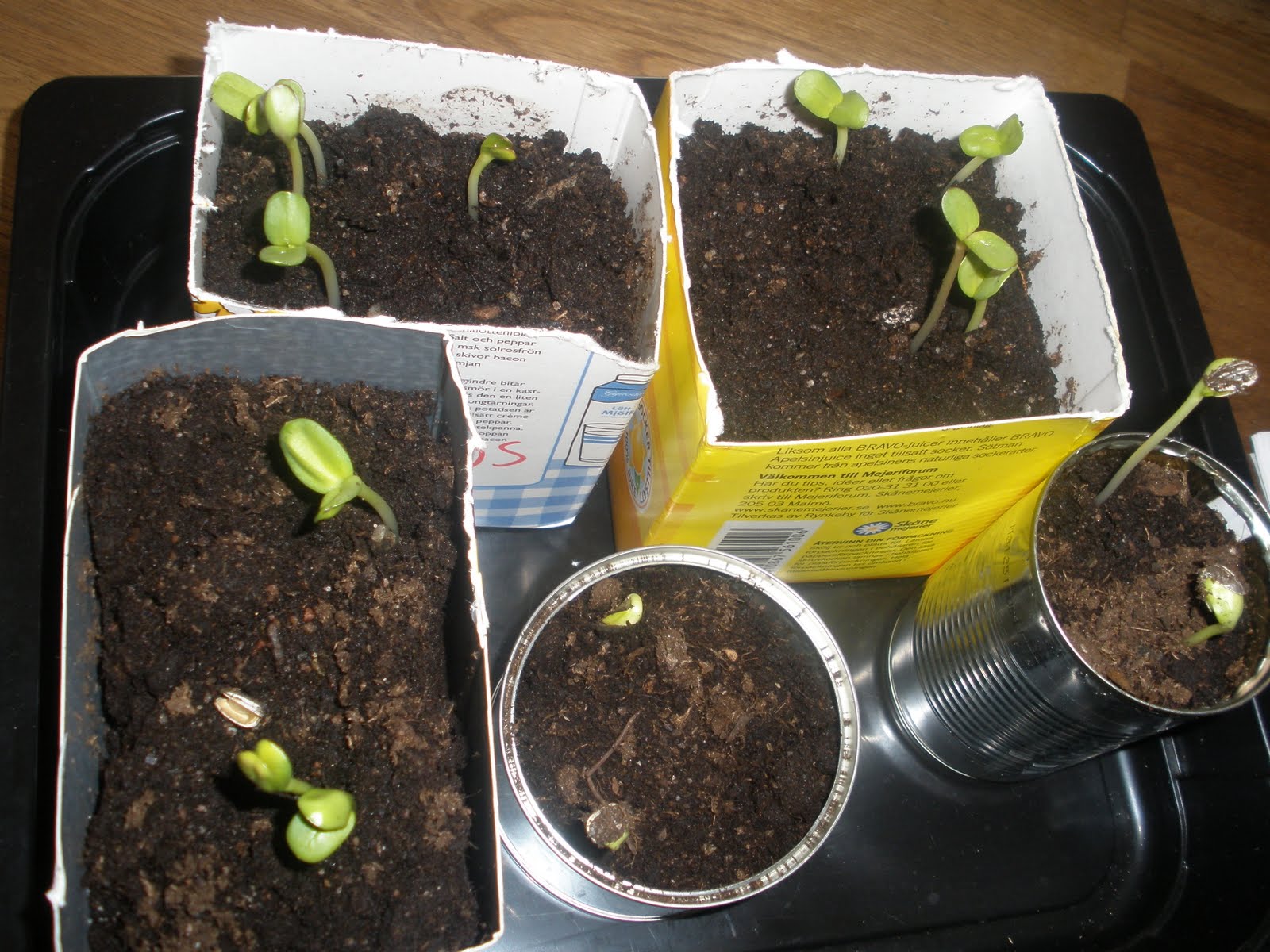 Jag va in till Köpis i går och då köpte jag lite penséer som ska planteras ute i en kruka. Fröna som jag sått inne har börjat växa, så solrosorna har jag fått binda upp.